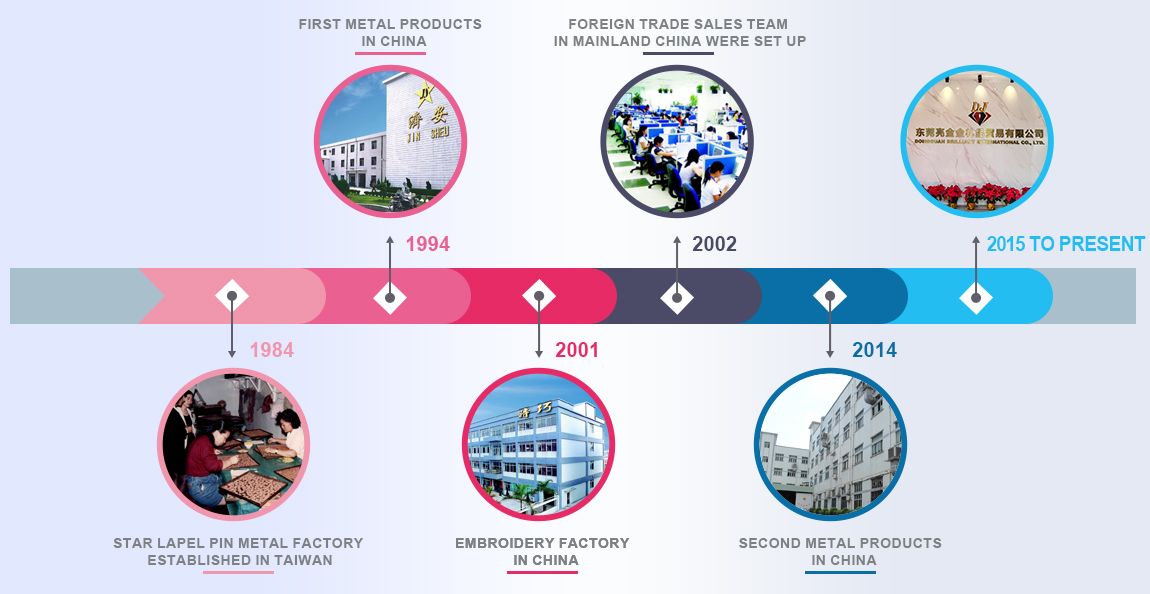 Initiating the establishment of our first metal factory in Taiwan in 1984, Brilliant has always strived to be the world's leading OEM manufacturer & centennial enterprise. Specializing in the production of all types of custom lapel pin, custom badge, custom coin, custom medal, custom medallion, custom keychain, custom embroidery patch, custom woven patch, custom chenille patch, custom printed patch/label, custom lanyard, custom rubber/silicone items, promotion gift and pet supplies, we are the most prestigious expert in the field of customized gifts & premiums. With the relentless pursuit of superior quality and continuous investment in innovative technology, Brilliant has gone through a remarkable milestone journey.