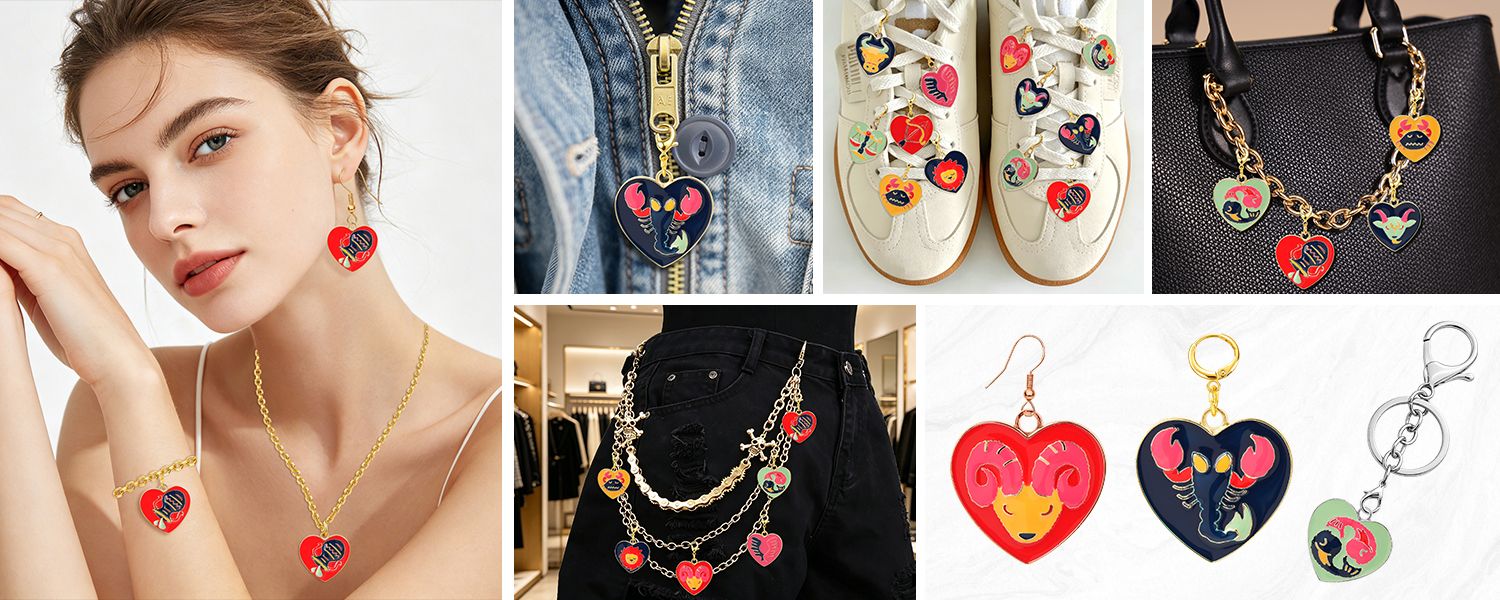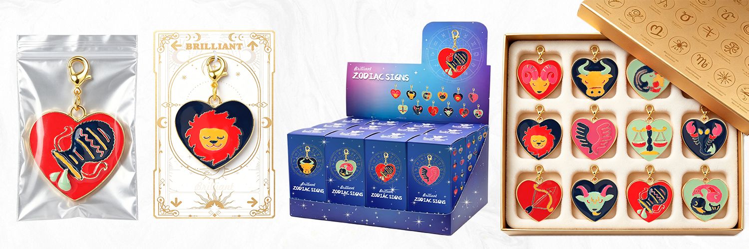 We offer 12 ready-designed zodiac charms with no mold fees and factory-direct pricing, making it easier for brands to launch new products with lower costs. Suitable for fashion brands, gift shops, and wholesale buyers. Our zodiac sign charms are die-cast from premium zinc alloy and comply with CPSIA and EN71-3 standards. They’re nickel-, lead-, and cadmium-free, making them safe, skin-friendly, and durable for everyday use. Each heart-shaped zodiac charm comes with a lobster clasp, so it can be easily attached to chains. Low minimum order quantities make these open-design zodiac charms ideal for small businesses, startups, or market testing. With customizable plating colors and a backside logo option, plus a wide range of packaging choices, our star sign charms are perfect for building your own branded collection. Feel free to contact us for samples or more details.