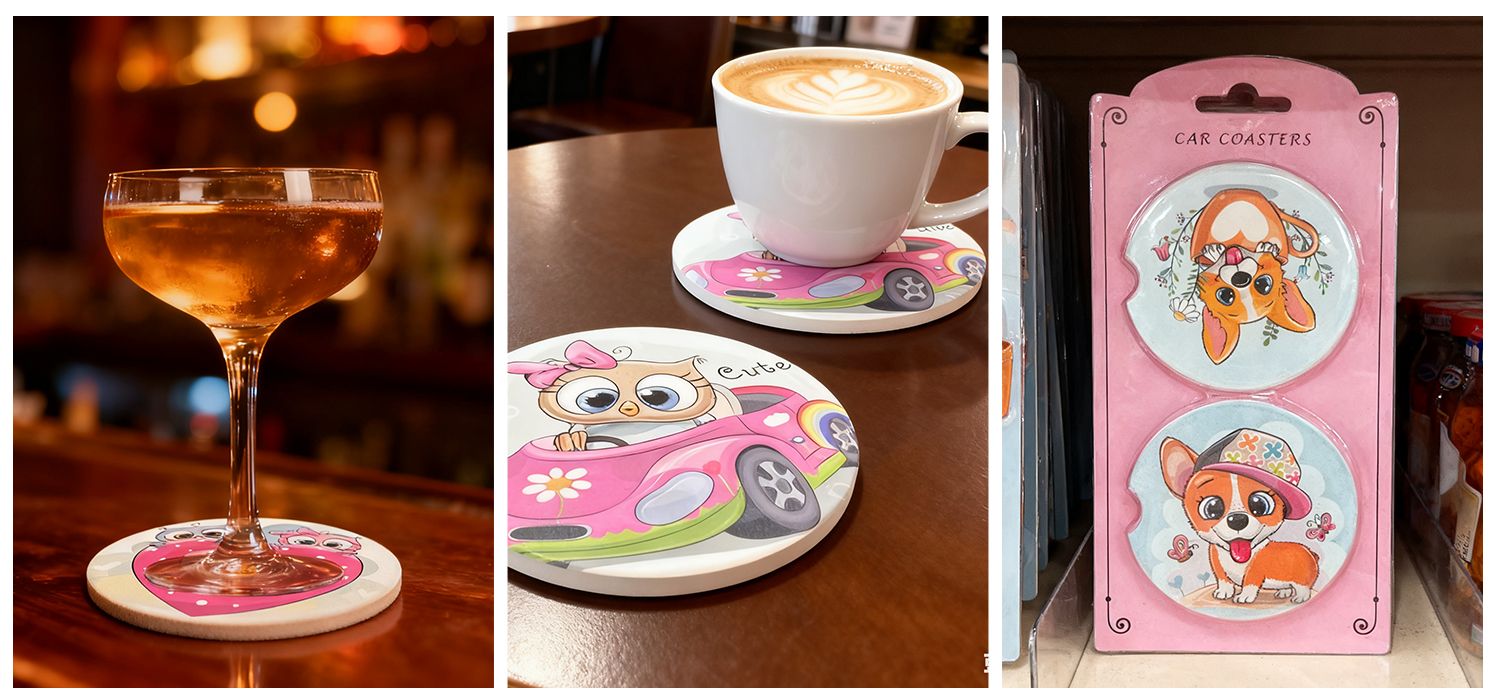 -20°C에서 200°C까지의 온도 저항 범위를 가진 우리의 내열 코스터는 아이스 커피부터 뜨거운 라떼까지 안전하게 사용할 수 있습니다. 우리는 두 가지 주요 유형을 제공합니다: 일상적인 가정이나 사무실 사용을 위한 표준 흡수성 세라믹 코스터와 컵 홀더에서 쉽게 제거할 수 있도록 엄지 그립이 있는 특별히 설계된 자동차 코스터입니다. 우리는 빠른 생산과 배송을 위해 준비된 12개의 아름답게 디자인된 개 코스터를 재고로 보유하고 있습니다. 이것은 귀여운 디자인의 인기를 빠르게 활용하고, 짧은 리드 타임으로 시장 수요를 충족시키며, 매우 실용적이고 시각적으로 매력적인 제품을 제공할 수 있게 해줍니다.