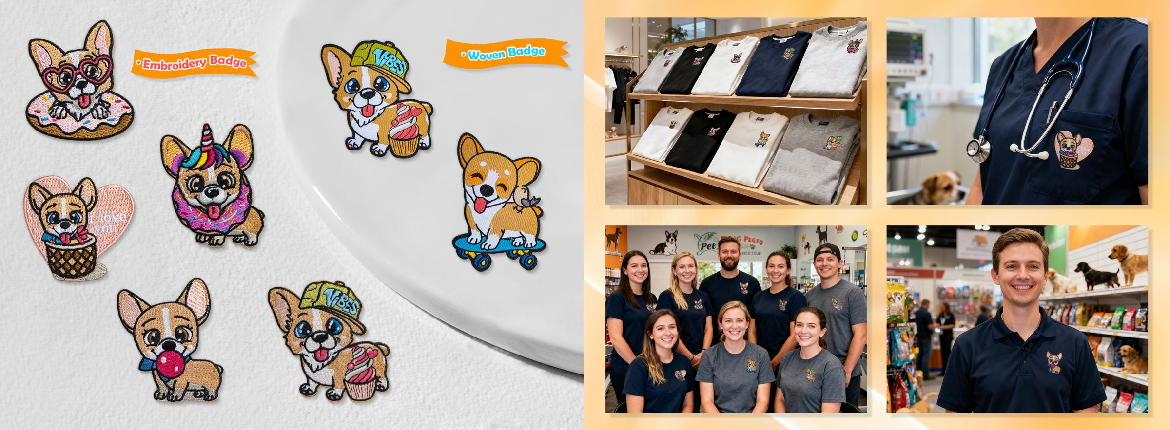Nostrae corgi tesserae confectae sunt ut sine intermissione in variis applicationibus negotiis integrentur. Haec venusta canum signa perfecte conveniunt venditoribus productorum animalium, salonibus animalium, et clinicae veterinariae quae quaerunt ut suas lineas productorum locupletent aut mercimonia notae creent. Itaque etiam idonea sunt pro uniformibus corporatis, vestimentis promovendis, et mercatu notae, praebentes modum parabilem ad augendam visibilitatem. Praeterea, haec amabilia canum signa possunt augere aspectum rerum venditarum sicut sacculi, pilei, et rucksaci, addendo valorem et identitatem productis tuis. Haec versatiles canum signa simplicem sed potentem modum praebent ad augendam praesentiam tui notae.