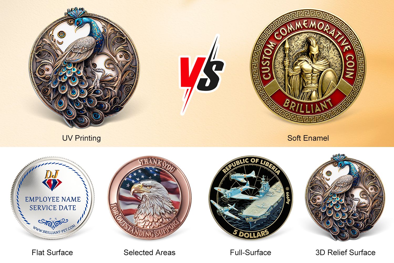 Seja você precisa de pequenas quantidades mínimas de pedido ou pedidos de alto volume, Brilliant Pet é sua fonte confiável para produção OEM Moedas Metálicas Impressas em UV Sob Medida | Acessíveis e Entrega Rápida com entrega global.
