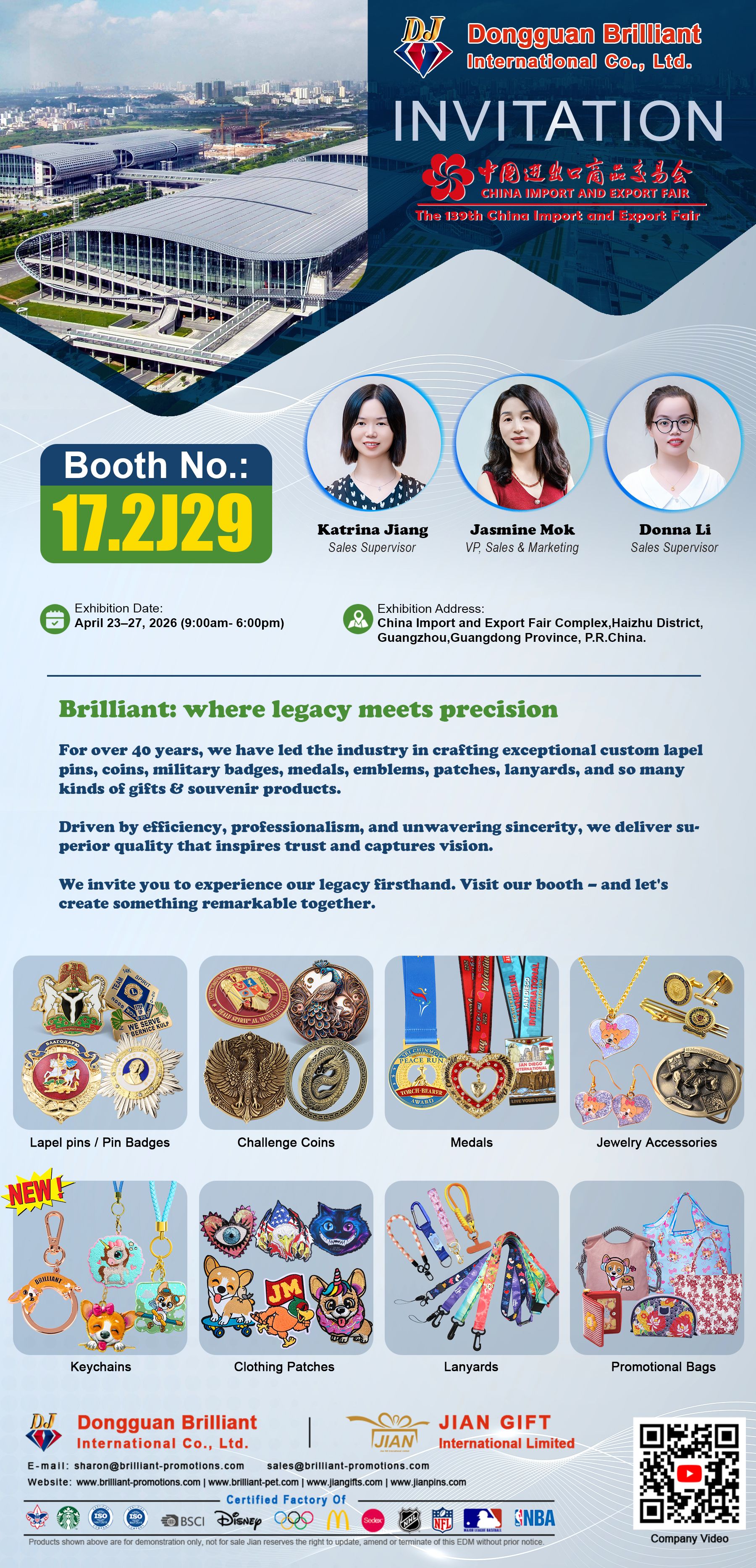 Мы сердечно приглашаем вас посетить наш стенд 17.2J29 на 139-й ярмарке импорта и экспорта Китая, с 23 по 27 апреля 2026 года. С более чем 42-летним опытом в отрасли, Brilliant зарекомендовала себя как надежный производитель, отличающийся качеством и инновациями. Мы предлагаем широкий ассортимент продукции — от металлических изделий, силиконовых и резино-пластиковых товаров до вышивки, кожаных, деревянных и смоляных изделий. Все продукты соответствуют стандартам безопасности CPSIA и EN71-3, а наш производственный процесс строго следует принципам управления качеством ISO 9001 для обеспечения согласованности и превосходства. Благодаря высокому качеству изготовления и надежной доставке, мы заслужили доверие мировых брендов и являемся сертифицированным поставщиком для Walmart, Disney, Porsche, Coca-Cola и NBC Universal Studios. Посетите нас и ощутите креативность и превосходство, которые делают Brilliant выдающимся.